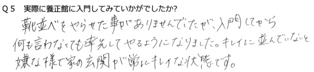 靴並べをやらせた事がありませんでしたが、入門してから何も言わなくても率先してやるようになりました。キレイに並んでいないと嫌な様で、家の玄関が常にキレイな状態です。