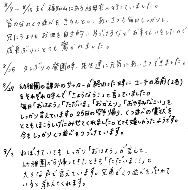 9/3  寝ぼけていてもしっかり「おはよう」が言えて、幼稚園から帰ってきた時も「ただいま!!」と大きな声で言えています。兄弟が靴並べを忘れていると教えてくれます。